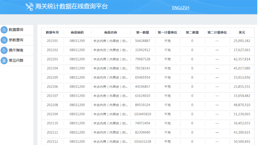 2021年我國未去內(nèi)殼(內(nèi)果皮)椰子進口數(shù)據(jù)。(網(wǎng)頁截圖)