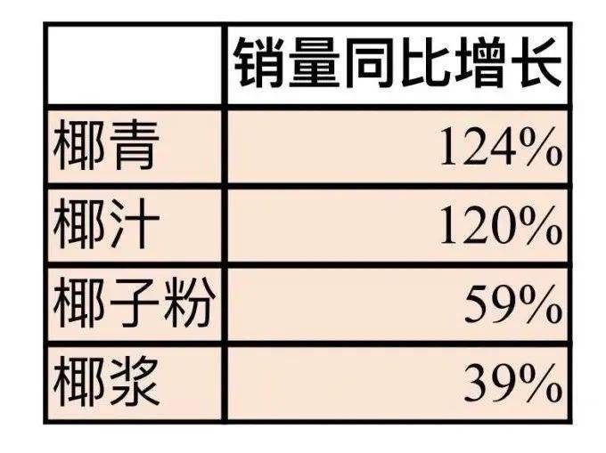 為何椰制品近年來廣受市場歡迎?業(yè)內(nèi)人士普遍分析認為這與椰制品“新奇”與“健康”等元素相關(guān)。目前,主打“輕健康”理念的植物蛋白類飲料大受市場歡迎,根據(jù)《2020植物蛋白飲料創(chuàng)新趨勢》,椰子風(fēng)味在植物蛋白飲料中增長也處于最快梯隊,增速高達109%。